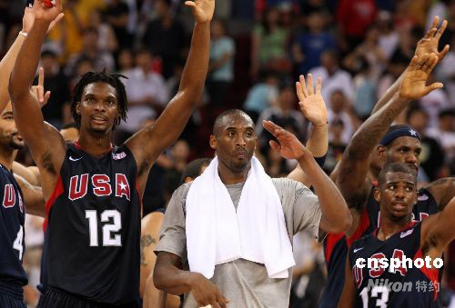 8月22日晚,北京奧運(yùn)會男子籃球半決賽第二場比賽在五棵松籃球館開戰(zhàn),美國“夢八隊”最后以101比81戰(zhàn)勝上屆奧運(yùn)會冠軍阿根廷隊,進(jìn)入決賽。賽后,科比率領(lǐng)美國眾球星向觀眾敬禮致謝。中新社發(fā) 任晨鳴 攝