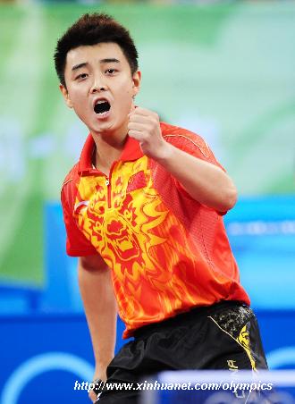 王皓在北京奧運(yùn)會(huì)乒乓球男子單打半決賽中以4比1戰(zhàn)勝瑞典老將佩爾森,晉級(jí)決賽。新華社記者徐家軍攝