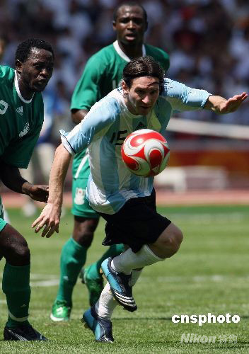 8月23日,北京奧運(yùn)會男足決賽在奧運(yùn)會主體育場——鳥巢舉行,雅典奧運(yùn)會冠軍阿根廷隊以1比0戰(zhàn)勝非洲雄鷹尼日利亞隊,蟬聯(lián)冠軍。圖為阿根廷隊核心梅西策劃的一次進(jìn)攻絕殺尼日利亞隊。 中新社發(fā) 任晨鳴 攝