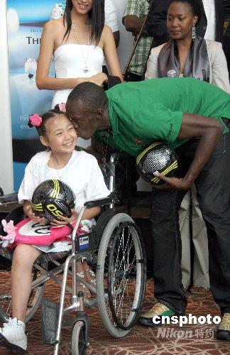 8月23日,北京奧運(yùn)會(huì)田徑一百米、二百米比賽金牌獲得者牙買加運(yùn)動(dòng)員尤塞恩·博爾特親吻來自汶川映秀鎮(zhèn)因大地震受傷的小女孩黃思雨,并向她贈(zèng)送一個(gè)簽名足球。當(dāng)天,博爾特在北京向中國紅十字基金會(huì)捐贈(zèng)善款五萬美元,以支持中國紅十字人道救助事業(yè)。中新社發(fā) 孫自法 攝