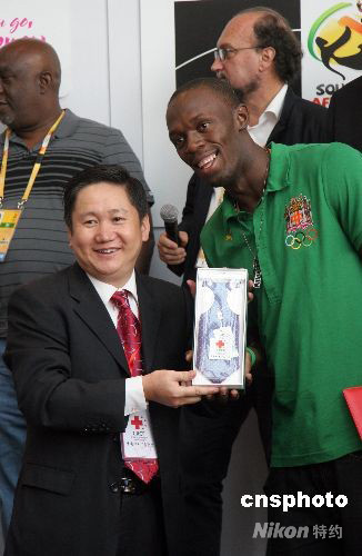 圖為中國紅十字基金會(huì)向博爾特回贈(zèng)一條領(lǐng)帶。 中新社發(fā) 孫自法 攝