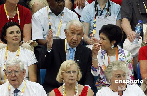 8月23日,國(guó)際奧委會(huì)終身名譽(yù)主席薩馬蘭奇,來到北京“水立方”觀看奧運(yùn)會(huì)花樣游泳集體項(xiàng)目決賽。 中新社發(fā) 杜洋 攝