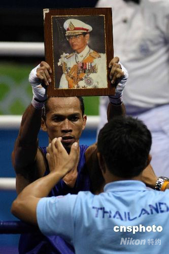 圖為他奪取冠軍后高舉泰國(guó)國(guó)王像登臺(tái)致謝。