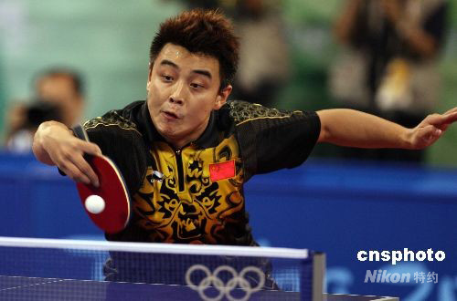 8月23日晚,王皓在北京奧運會乒乓球男子單打決賽中以1:4負于隊友馬琳,獲得亞軍。中新社發(fā) 武仲林 攝