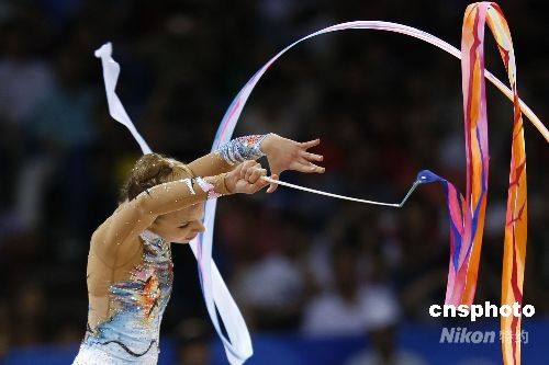 8月23日晚,在北京工業(yè)大學(xué)體育館舉行的北京奧運(yùn)會(huì)藝術(shù)體操個(gè)人全能決賽中,白俄羅斯選手因娜·茹科娃獲得銀牌。圖為因娜·茹科娃在比賽中。 中新社發(fā) 盛佳鵬 攝