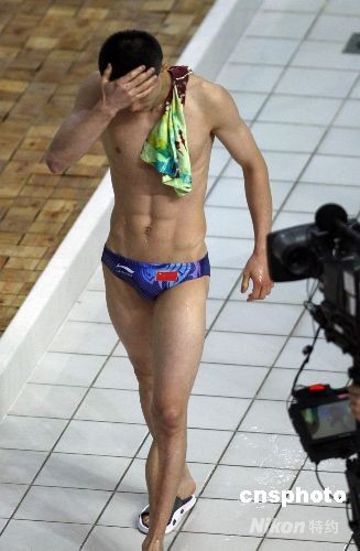圖為周呂鑫第六跳出現(xiàn)較大失誤,在之前領(lǐng)先30分的情況下丟掉冠軍,憾失金牌。中新社發(fā) 杜洋 攝