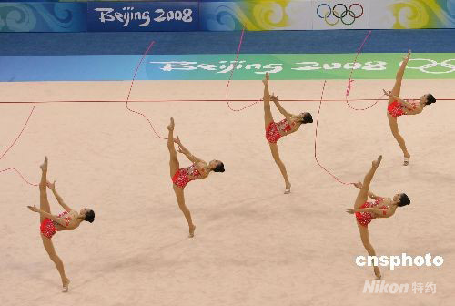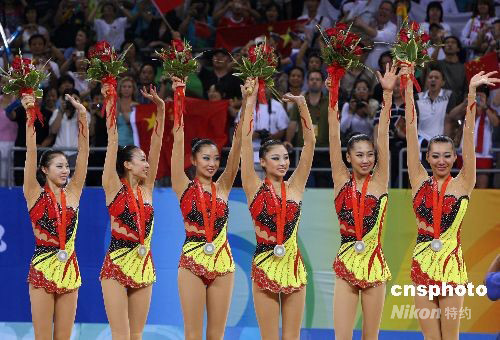 8月24日,中國(guó)藝術(shù)體操隊(duì)在北京奧運(yùn)會(huì)藝術(shù)體操集體全能決賽中奪得銀牌,取得歷史性突破。中新社發(fā) 武仲林 攝