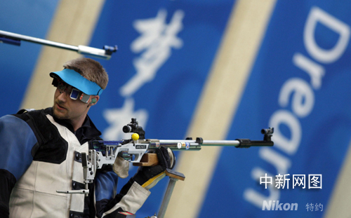 美國神槍手埃蒙斯因?yàn)樽詣?chuàng)的“歪把槍”法,最后一槍再次射偏“夢想”,繼雅典奧運(yùn)會后,又再次拱手讓出只要正常發(fā)揮就“唾手可得”的男子50米步槍三種姿勢金牌。 中新社發(fā) 盛佳鵬 攝