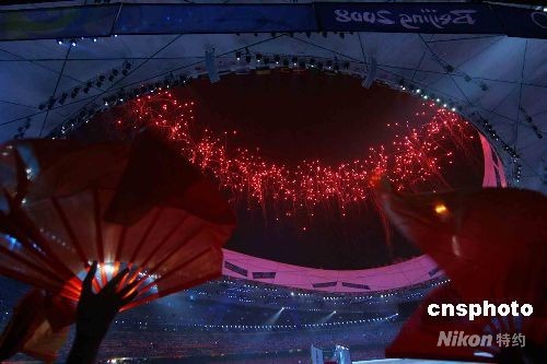 8月24日晚,第二十九屆夏季奧林匹克運動會在北京閉幕。盛大閉幕式開始,鳥巢焰火齊放,焰火圖案數(shù)字從29開始倒計時,最后一個數(shù)字“0”用拉手花束炸開一個滾動的、火紅的圓圈,圓圈周長長達600米,相當于圍繞鳥巢碗口“跑”一圈。中新社發(fā) 武仲林 攝