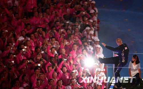 8月24日,北京奧運(yùn)會閉幕式在鳥巢舉行。在“倫敦8分鐘”的表演中,英國球星大衛(wèi)·貝克漢姆(右二)亮相,踢出“倫敦邀請”。