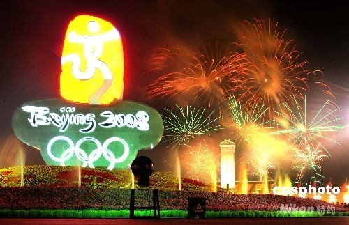 8月24日晚,一名外國人身披中國國旗在天安門廣場觀看慶祝奧運會閉幕而燃放的煙花。中新社發(fā) 廖攀 攝