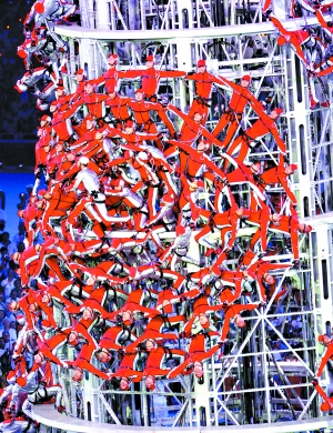陳維亞說,2006年11月11日,閉幕式團(tuán)隊(duì)剛剛成立,最初的創(chuàng)意中就有這么一個“塔”,這是從苗族的踩刀梯表演中獲得的靈感。最早的設(shè)想是用搭梯子方式進(jìn)行,由于存在安全隱患而放棄。最后,主創(chuàng)人員找到了現(xiàn)在的形式,就是由人去攀登“記憶之塔”。396人徒手攀登,更加直觀地體現(xiàn)了拼搏精神。