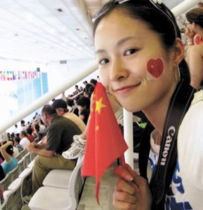 在水立方觀看比賽的江一燕,忙里偷閑對(duì)著鏡頭來個(gè)回眸一笑。