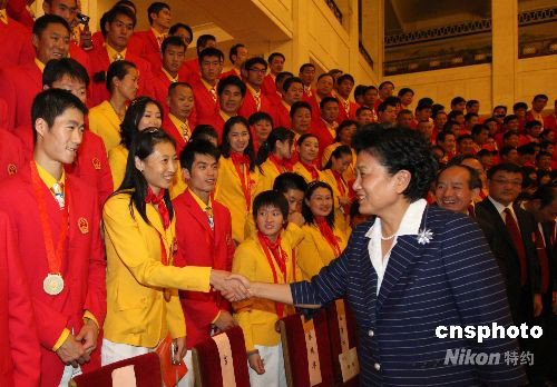 8月26日,2008年北京奧運會中國體育代表團總結(jié)大會在北京人民大會堂金色大廳舉行。中共中央政治局委員、國務(wù)委員、北京奧組委副主席劉延?xùn)|出席大會并與運動員握手致意、合影留念。 中新社發(fā) 廖文靜 攝