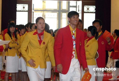 8月26日,2008年北京奧運(yùn)會(huì)中國體育代表團(tuán)總結(jié)大會(huì)在北京人民大會(huì)堂金色大廳舉行。仲滿、劉子歌出席北京奧運(yùn)會(huì)中國體育代表團(tuán)總結(jié)大會(huì)。中新社發(fā) 廖文靜 攝