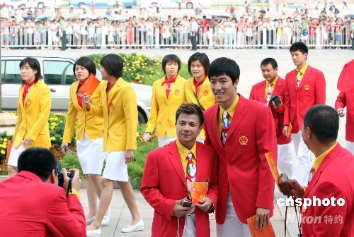 8月26日,2008年北京奧運(yùn)會(huì)中國體育代表團(tuán)總結(jié)大會(huì)在北京人民大會(huì)堂金色大廳舉行,運(yùn)動(dòng)員劉翔出席大會(huì)倍受關(guān)注。圖為北京奧運(yùn)會(huì)舉重冠軍張湘祥與劉翔合影。 中新社發(fā) 廖文靜 攝