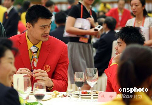 姚明、林丹參加北京奧運(yùn)中國體育代表團(tuán)慶祝宴會。中新社發(fā) 廖文靜 攝