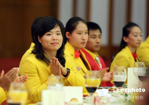 陳艷青參加北京奧運(yùn)中國(guó)體育代表團(tuán)慶祝宴會(huì)。 中新社發(fā) 廖文靜 攝