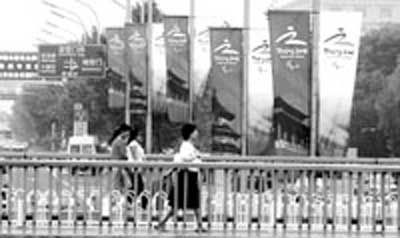 昨天,很多市民發(fā)現(xiàn)大街上的“中國印”旗幟悄然換成了殘奧會(huì)的“天地人”旗幟(如圖)。據(jù)悉,近7萬面殘奧會(huì)旗幟轉(zhuǎn)換工作將于9月初結(jié)束。