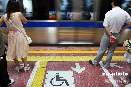 8月27日,一種白色無(wú)障礙標(biāo)識(shí)開(kāi)始在北京地鐵1號(hào)、2號(hào)線(xiàn)各站臺(tái)出現(xiàn),使北京地鐵無(wú)障礙設(shè)施進(jìn)一步得到完善,迎接即將到來(lái)的殘奧會(huì)。圖為北京地鐵2號(hào)線(xiàn)阜成門(mén)站臺(tái)的白色無(wú)障礙標(biāo)識(shí)。中新社發(fā) 鄭雄增 攝