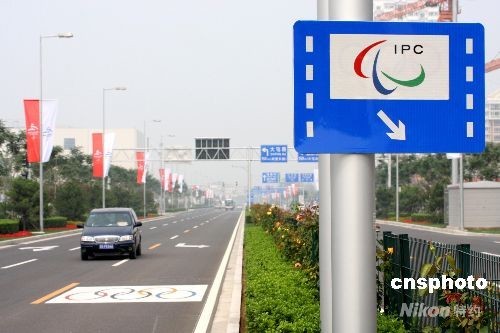 2008年8月28日,北京23條殘奧會專用車道分為6個時段陸續(xù)啟用。從27日晚開始,北辰西路的殘奧會專用車道上出現(xiàn)了“IPC”標(biāo)志。 據(jù)悉,殘奧會專用車道總長209.9公里,比奧運(yùn)會專用車道縮短了70多公里,其中東二環(huán)部分路段等7條道路成為今天首批投入使用的殘奧會專用車道。中新社發(fā) 吳芒子 攝