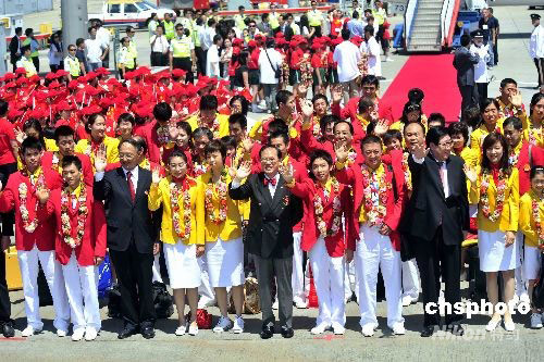 中新網(wǎng)8月29日電 北京奧運(yùn)會(huì)國(guó)家隊(duì)金牌運(yùn)動(dòng)員代表團(tuán)于29日中午11時(shí)許抵達(dá)香港。香港特首曾蔭權(quán)前往迎接。