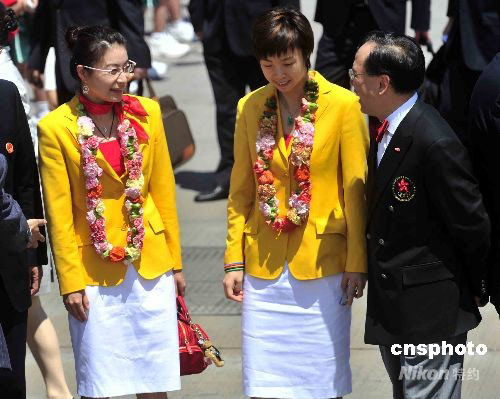 郭晶晶(左)與張怡寧在機(jī)場(chǎng)受到特首曾蔭權(quán)的歡迎。中新社發(fā) 譚達(dá)明 攝
