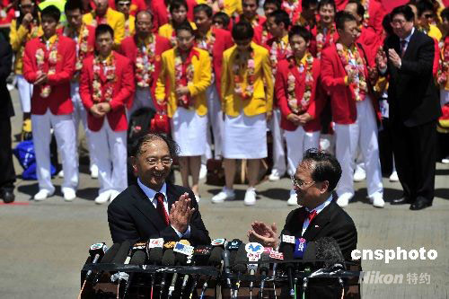 八月二十九日上午十一時(shí),國家奧運(yùn)金牌運(yùn)動員代表團(tuán)乘坐飛機(jī)抵達(dá)香港,特區(qū)行政長官曾蔭權(quán)等官員到場迎接。率團(tuán)來港的國家體育總局局長劉鵬(左)表示,今次來港目的是為真誠感謝對祖國體育事業(yè)大力支持的香港同胞。中新社發(fā) 譚達(dá)明 攝