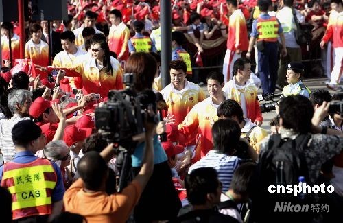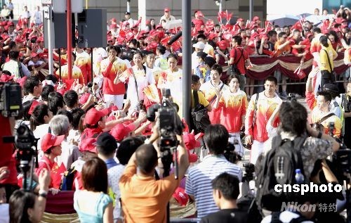 八月三十日上午八時(shí),北京奧運(yùn)會內(nèi)地金牌運(yùn)動員代表團(tuán)到香港金紫荊廣場觀看升旗禮,圖為運(yùn)動員與大批香港市民見面。中新社發(fā) 張勤 攝