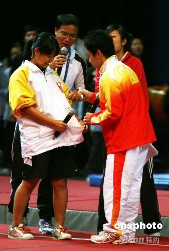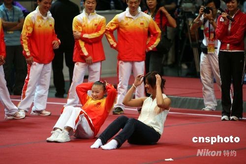 北京奧運(yùn)會內(nèi)地金牌運(yùn)動員代表團(tuán)在香港伊麗莎白體育館作示范表演,并與青少年同樂。中新社發(fā) 洪少葵 攝