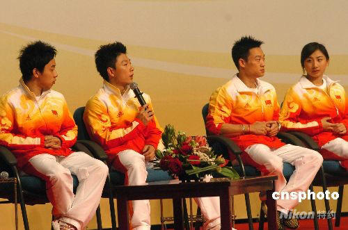 訪問澳門的奧運(yùn)金牌運(yùn)動員代表九月一日上午與澳門青少年真情對話。圖為體操運(yùn)動員李小鵬與澳門學(xué)生交流。中新社發(fā) 畢永光 攝