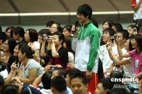 訪問澳門的奧運金牌運動員代表九月一日上午與澳門青少年真情對話。澳門五十所學校二千五百名學生出席對話會。圖為澳門學生踴躍提問。中新社發(fā) 畢永光 攝