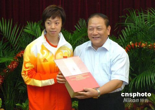 中央駐澳聯(lián)絡(luò)辦九月一日宴請?jiān)L問澳門的奧運(yùn)金牌運(yùn)動(dòng)員代表團(tuán)。圖為中聯(lián)辦主任白志健向運(yùn)動(dòng)員代表張怡寧贈(zèng)送紀(jì)念品。中新社發(fā) 畢永光 攝