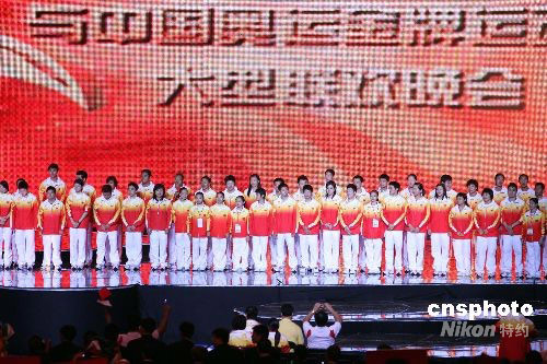 九月一日晚,北京奧運(yùn)會金牌運(yùn)動員代表團(tuán)出席在澳門東亞運(yùn)動會體育館舉行的大型聯(lián)歡晚會,與澳門市民分享他們在奧運(yùn)會上拼搏奪金的精神。中新社發(fā) 洪少葵 攝