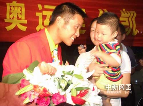 北京奧運會結(jié)束已近十天,妻子徐鋒月一直期盼著丈夫的歸來。對于她來說,丈夫今晚歸來也是很突然的!皧W運會結(jié)束后,他還是特別的忙,出席各式各樣的活動,每天都要忙到十二點才能休息,所以我很少能聯(lián)系上他。直到昨天,他才告訴我今天要回來!毙熹h月還特意將十五個月大的兒子帶到了蕭山機場。