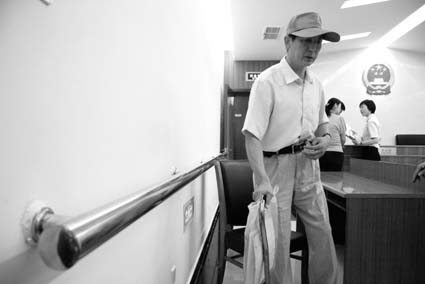 圖為奧運村無障礙法庭內(nèi)安裝了便于殘障人員扶持的金屬桿。庭審結(jié)束,祁寶麟起身準(zhǔn)備離開法庭 李松 黃潔 徐偉倫攝