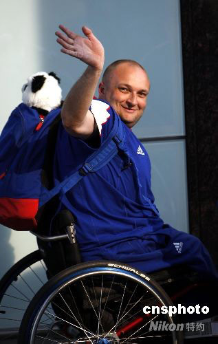 圖為英國(guó)殘奧會(huì)運(yùn)動(dòng)員身背熊貓玩偶抵達(dá)北京首都國(guó)際機(jī)場(chǎng)。