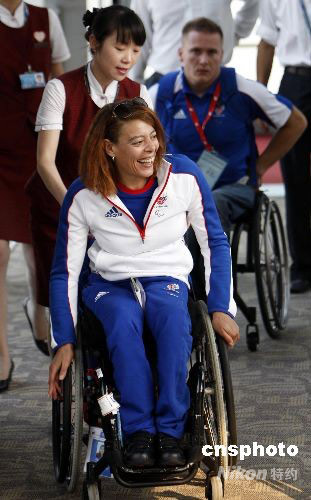 圖為機(jī)場(chǎng)工作人員為抵京的英國(guó)殘奧會(huì)運(yùn)動(dòng)員提供服務(wù)。