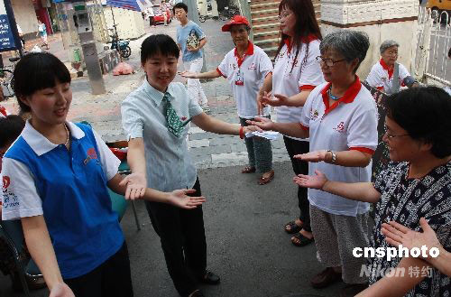 9月3日,北京市民在東四郵局門口與志愿者們一起學習手語“北京歡迎你”,迎接即將來臨的殘奧盛會。這一天,是北京殘奧會志愿服務的行動日。中新社發(fā) 鄭雄增 攝
