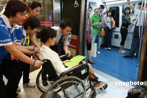 9月3日,在北京主要交通路口、地鐵站、郵局、旅游區(qū)和奧賽場館附近,隨處可見面帶笑容的志愿者們。這一天,是北京殘奧會志愿服務(wù)的行動日。北京燈市口地鐵站點(diǎn)志愿者正在進(jìn)行殘奧會前的最后演練。殘奧會期間,乘坐輪椅的殘障人士如需坐地鐵,可提前打電話預(yù)約,到達(dá)地鐵站后有志愿者和工作人員提供一對一式服務(wù)。中新社發(fā) 鄭雄增 攝