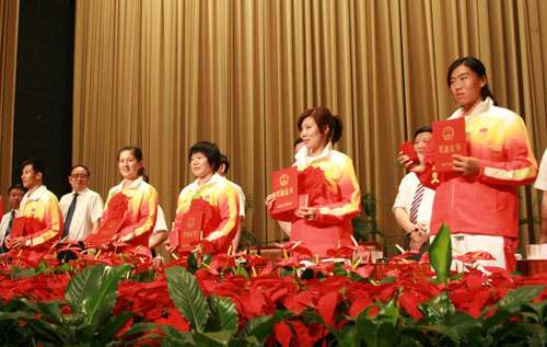 表彰會(huì)上,王峰等5名金牌運(yùn)動(dòng)員和教練員馬文輝、吳俐知被授予“山東青年五四杰出貢獻(xiàn)獎(jiǎng)?wù)隆,譚淼等獲得“山東省新長(zhǎng)征突擊手標(biāo)兵”榮譽(yù)稱號(hào)。王峰、奚愛(ài)華等還榮獲山東省“富民興魯”勞動(dòng)獎(jiǎng)?wù)路Q號(hào),張娟娟、奚愛(ài)華還獲山東省三八紅旗手標(biāo)兵榮譽(yù)稱號(hào)和“山東省先進(jìn)工作者”。王峰、杜麗、劉春紅以及獲得銀牌、銅牌的運(yùn)動(dòng)員被記一等功。