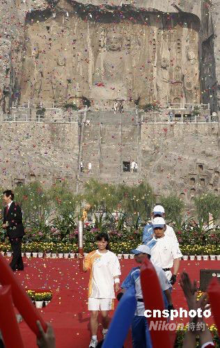 9月4日,火炬手在最具洛陽特色的城市名片--世界文化遺產(chǎn)龍門石窟景區(qū)內(nèi)傳遞殘奧會火炬。當(dāng)日,北京2008殘奧會火炬在千年帝都、牡丹花城洛陽傳遞,有65名火炬手參加傳遞。北京2008殘奧會火炬?zhèn)鬟f共有兩條線路,一是“時代風(fēng)采線”,二是“中華文明線”,洛陽是“中華文明線”5個殘奧會火炬?zhèn)鬟f城市之一,也是進入北京前的最后一個傳遞城市。9月5日兩路火炬將在北京匯合,9月6日晚在殘奧會開幕式主會場點燃主火炬。中新社發(fā) 張曉理 攝