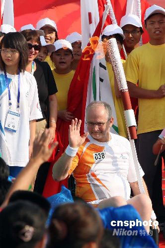 火炬手、國際殘奧委會(IPC)主席菲利普·克雷文(Philip Craven)傳遞火炬。中新社發(fā) 張宇 攝