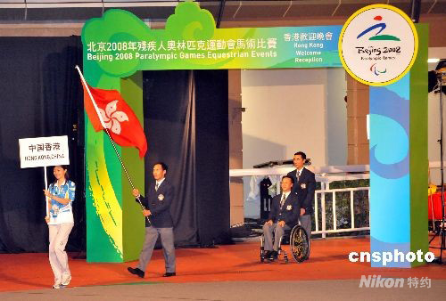 九月六日,北京二零零八年殘奧會馬術(shù)比賽開幕式在香港舉行歡迎晚會,香港殘奧馬術(shù)選手葉少康在運動員入場式上進場。中新社發(fā) 鄧慶樂 攝