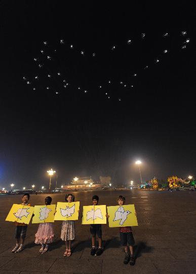 9月6日,來(lái)自中國(guó)、喀麥隆、以色列、巴基斯坦和愛(ài)爾蘭(從左到右)的小朋友舉起和平鴿圖片與天安門上空的和平鴿造型焰火遙相呼應(yīng)。當(dāng)日,北京2008年殘奧會(huì)開(kāi)幕式在國(guó)家體育場(chǎng)隆重舉行。新華社記者 王小川 攝