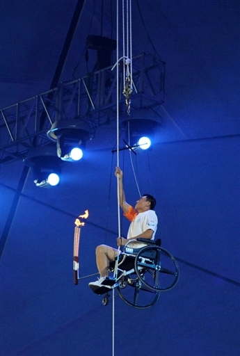 中新網(wǎng)9月6日電 北京殘奧會開幕式今晚在北京國家體育場隆重開幕,殘疾人跳高運(yùn)動員侯斌點(diǎn)燃?xì)垔W會圣火主火炬臺。