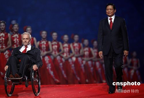9月6日晚,北京2008年殘奧會開幕式在國家體育場“鳥巢”舉行,中國國家主席胡錦濤,國際殘奧委會主席菲利普.克雷文先生等出席開幕式。圖為北京奧組委主席劉淇,陪同國際殘奧委會主席菲利普.克雷文先生走向場地中心講臺準(zhǔn)備致辭。中新社發(fā) 杜洋 攝