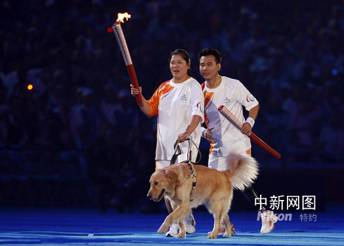 北京殘奧會(huì)開幕式上平亞麗帶導(dǎo)盲犬傳遞火炬