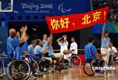 9月7日,北京殘奧會輪椅籃球比賽中,瑞典隊在比賽結(jié)束時打出了“你好,北京!”、“謝謝!中國!”的標語。中新社發(fā) 杜洋 攝