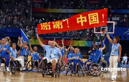 圖:殘奧會輪椅籃球瑞典隊打出漢字標語